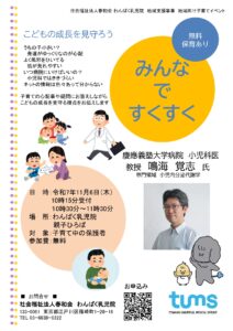 講演会のご案内~慶応義塾大学病院小児科教授 鳴海先生 2025年10月10日 慶応義塾大学病院小児科教授の鳴海先生を講師にお招きして 子育てについての講演会「みんなですくすく」を 開催することになりました!! 参加費無料、子育て中の方はもちろん ご興味のある方はどなたでもご参加いただけます👶 講演会中はお子さまをお預かりすることも可能です🍀 お申し込みは添付チラシのQRコードまたは下記リンクからお願いします😊 ≪みんなですくすくお申込み≫