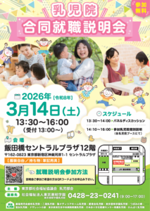合同就職説明会が開催されます 2026年1月28日 2026年3月14日(土)13:30~16:00 飯田橋セントラルプラザにて 乳児院合同就職説明会が開催されます‼️ 都内にある11の乳児院が全て参加します👶 乳児院でのお仕事にご興味のある方は ご予約の上、ぜひ足をお運びください😊 私たちもブースでお待ちしております✨ ご予約はこちらのチラシのQRコードからお願いします😊