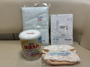 バスタオル、敷布団カバー、粉ミルク、シリコンエプロンをいただきました